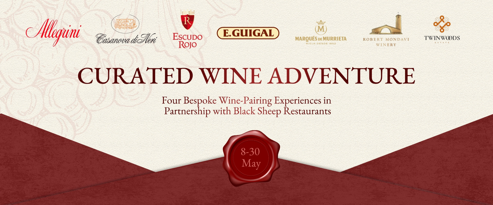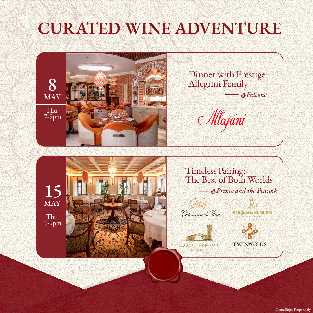 This May, elevate your dining experience as we proudly present four bespoke wine-paring dinners in collaboration with Black Sheep Restaurants, leading you into the magnificent world of fine wines. From 8 to 30 May, join us for an unforgettable wineadventure featuringremarkable brands like Allegrini, E. Guigal, Escudo Rojo, Casanova di Neri, Marqués de Murrieta, Robert Mondavi Winery, and Twinwoods.From the rolling vineyards of Italy to the sun-kissed valleys of California, each wine reflects the unique terroir and craftsmanship of its origin. Each dinner promises to be a celebration of flavor, where expertly crafted dishes are harmoniously paired with exceptional wines, creating a symphony of taste that you won’t want to miss.